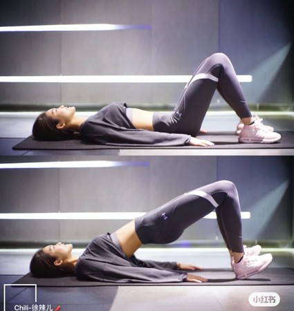 先平躺于地面,双腿弯曲并张开与肩同宽,臀部发力夹紧往上抬高,抬至高点停留3秒再落下,保持稳定速度上下,20次为一组,共做2组。