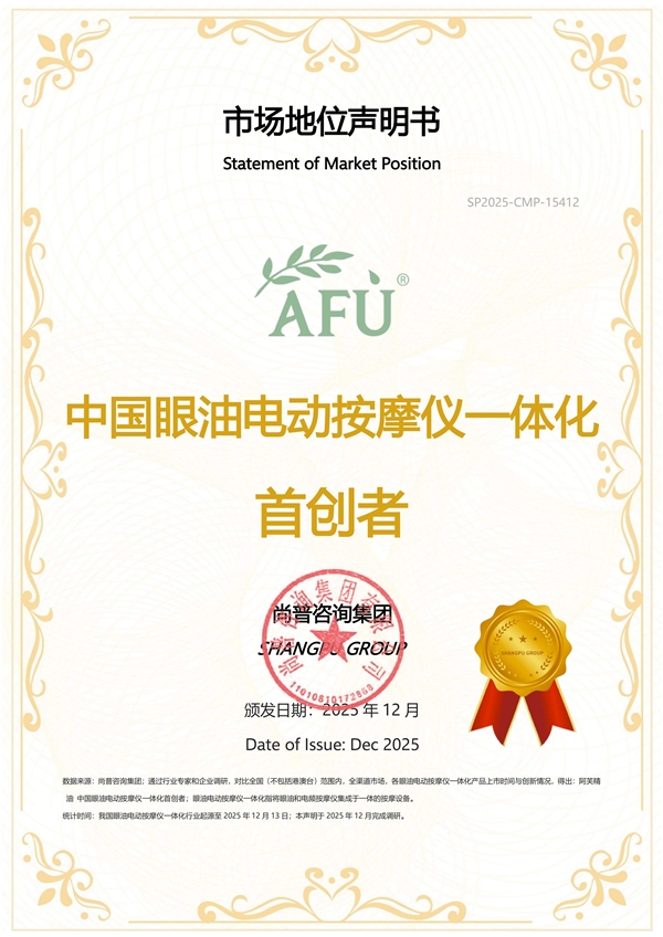 2025年12月,尚普咨询集团向阿芙精油颁发市场地位声明书。阿芙精油荣获【阿芙精油 中国精油护理SPA领军品牌】、【阿芙精油 中国眼油电动按摩仪一体化首创者】两项市场地位声明,标志着其在精油护肤行业的标杆地位及市场对其的深度信赖。
