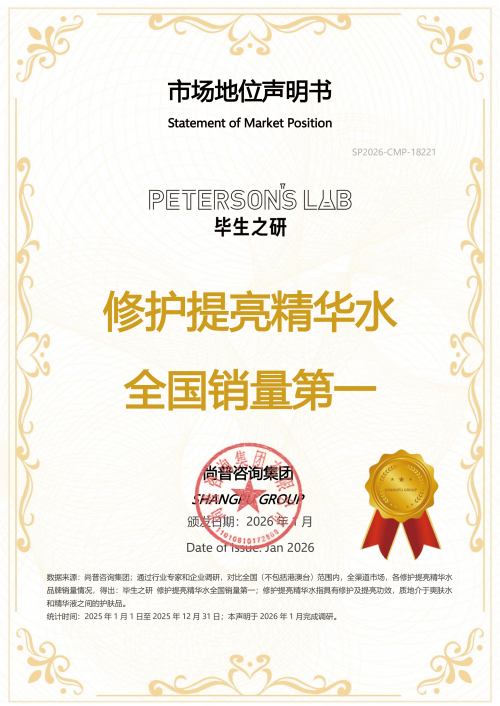 2026年1月,尚普咨询集团向毕生之研颁发市场地位声明书。毕生之研荣获【毕生之研修护提亮精华水全国销量第一】市场地位声明,标志着其在护肤行业的标杆地位及消费者的高度认可与信赖。
