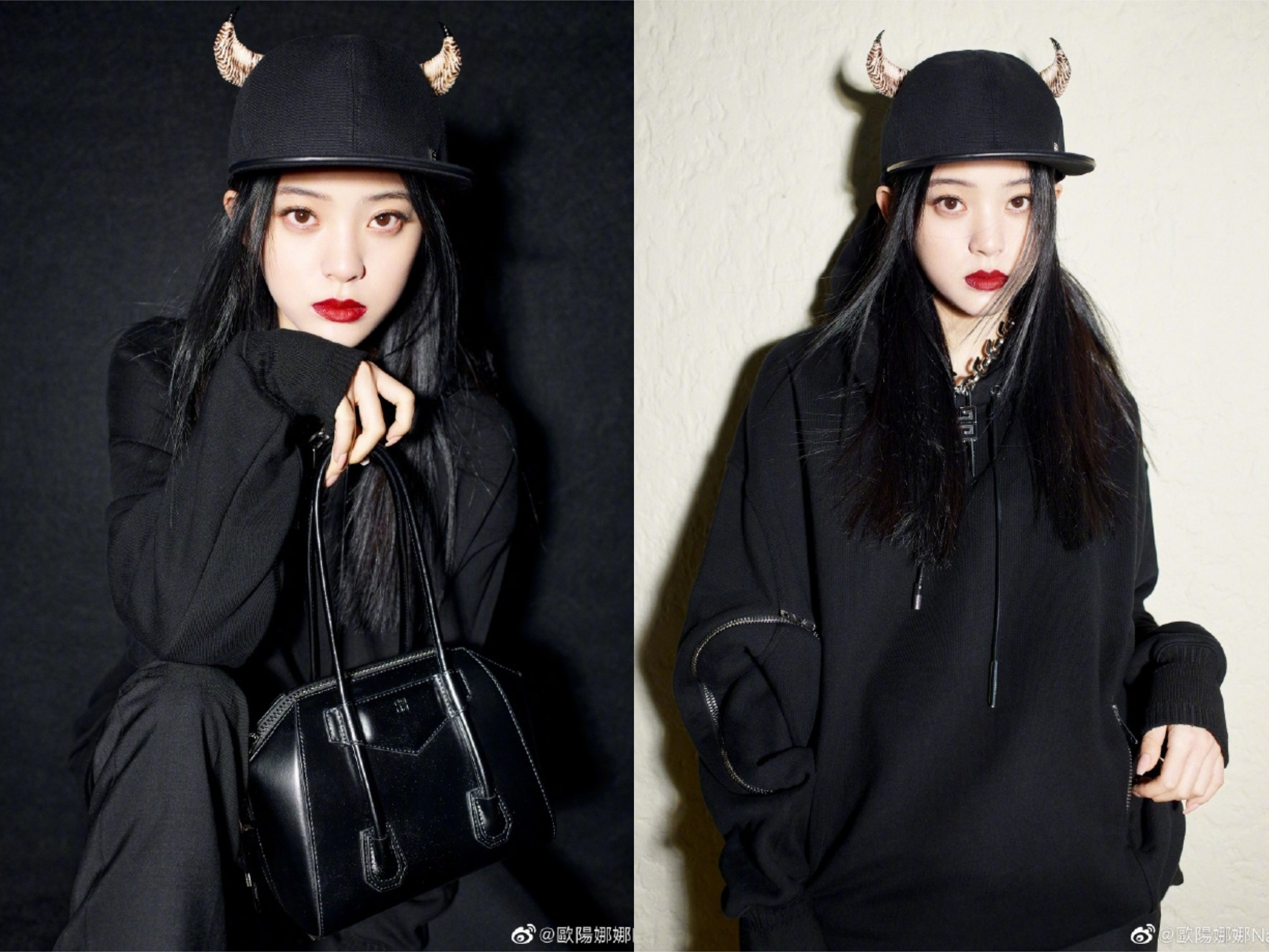 欧阳娜娜身上全套服装来自GIVENCHY 2021春夏最新系列,黑色的卫衣上利用特殊拉链口袋设计点出细节,与脚上的厚底拖鞋搭配营造出街头前卫风格,手上的小型ANTIGONA手袋则是近期时尚圈曝光率超高的爆款,接著看到娜娜头上一眼就能吸住目光的“羊角帽”,辨识度极高,成为粉丝们讨论的焦点,“羊角很酷!”、“小恶魔好可爱。”、“我的小牛。”各种联想都有,甚至有网友提出疑问:“牛魔王?”