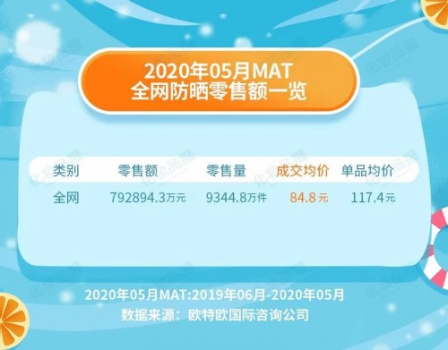 从2020年3月,天猫国际发布的《解码中国消费者新防晒时代》报告显示,天猫防晒化妆品的销售额在一个月内达到5亿元,环比涨幅达401%。再看欧特欧国际数据,在过去一个滚动年(2019年6月-2020年5月),全网防晒销售额79.29亿元,同比增长14%,零售量9344.8万件。在销量方面,TOP20的品牌中,韩国防晒品牌RE:CIPE玥之秘销量占比最高(5.89%),折算后销量为550万件。